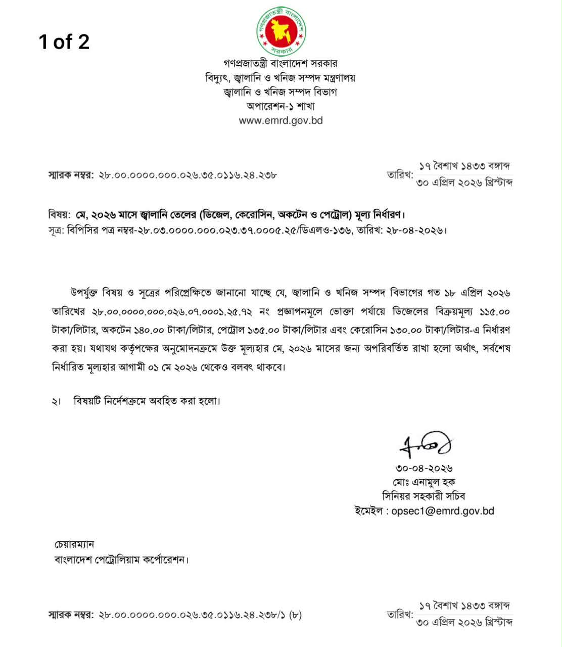 মে মাসের জন্য জ্বালানির দাম অপরিবর্তিত রাখার বিষয়ে জ্বালানি ও খনিজ সম্পদ বিভাগের বিজ্ঞপ্তিতে বলা হয়েছে, গত ১৮ এপ্রিল ভোক্তা পর্যায়ে ডিজেলের বিক্রয়মূল্য লিটারে ১১০ টাকা, অকটেন ১৪০ টাকা, পেট্রোল ১৩৫ টাকা এবং কেরোসিন ১৩০ টাকা নির্ধারণ করা হয়। যথাযথ কর্তৃপক্ষের অনুমোদনক্রমে ওই মূল্যহার মে, ২০১৬ মাসের জন্য অপরিবর্তিত রাখা হলো। অর্থাৎ, সর্বশেষ নির্ধারিত মূল্যহার ১ মে, ২০১৬ থেকেও বলবৎ থাকবে।